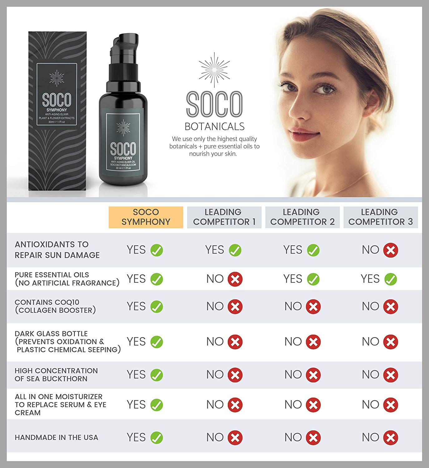 • THE PERFECT MOISTURIZER: Bring out your natural radiance with our SOCO Symphony Anti Aging Elixir Face Oil. This facial moisturizer is designed to replace cream, serum & eye cream: It is a potent skin superfood all in one bottle. Exquisite formula of Collagen boosting CoQ10 with Sea Buckthorn Oil, Argan, Rosehip, Pomegranate Seed Oil, Avocado, Red Raspberry, Jojoba, Helichrysum & Neroli Essential Oils, Vitamins A C & E.